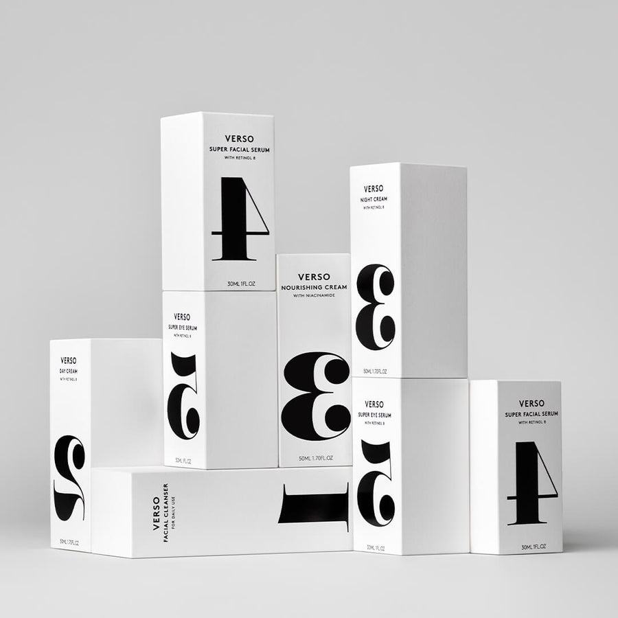 The products should be combined as desired, depending on your skincare routine. E.g., a daytime routine could include numbers/categories in the following order: 1-Cleanse, 4-Serum, 2-DayCream. Consequently, the numbers play an essential role and are very connected to the Verso brand and graphical identity.